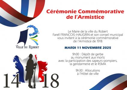 Le Maire de la ville du Robert Farell FRANCOIS-HAUGRIN et son conseil municipal vous invitent à la cérémonie commémorative de l'Armistice de 1918 MARDI 11 NOVEMBRE 2025