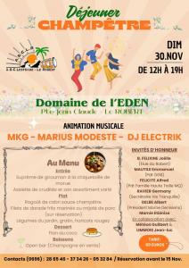 L'association ASCLR vous invite à son "Déjeuner Champêtre" le dimanche 30 novembre 2025 de 12h à 19h au Domaine de l'Eden au quartier Pointe Jean Claude.
