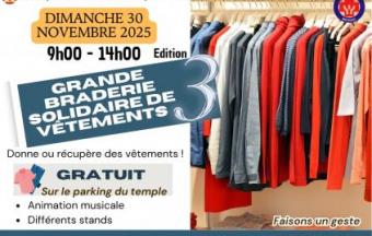 Grande braderie solidaire de vêtements organisée par le département DORCAS sur le parking du temple adventiste Galaad du Robert de 9h à 14h00. Donnez ou récupérez des vêtements.