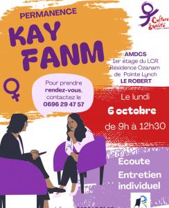 L'association "Culture et Egalité" vous informe de sa permanence "KAY FANM" le lundi 6 octobre 2025 de 9h à 12h30 à l'Antenne Municipale de Développement et de Cohésion Sociale (1er étage du LCR - Résidence Ozanam de Pointe Lynch) au Robert.