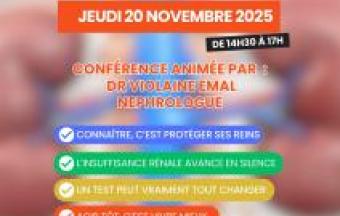 L'association Service Médiation Sociale vous invite à sa conférence sur le thème de la maladie rénale chronique, animée par le Docteur VIOLAINE EMAL (Néphrologue), le jeudi 20 novembre 2025 de 14h30 à 17h00 à l'espace Krist'Events (étage de l'immeuble Atlantis - rue Vincent Allègre 97231 le...