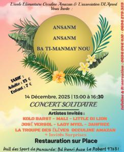 l'école élémentaire Occuline Amazan et l'association DLAprod vous invite à son concert solidaire "Ansanm Ansanm Ba ti-manmay nou" dimanche 14 décembre 2025 de 13h à 16h30 au Hall des sports de Mansarde.