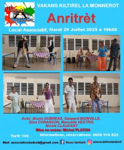 Dans le cadre de "Vakans kiltirel Lamonnéro", l'association Lanbéli vous propose la pièce de théâtre "ANRITRET" avec Téyat Lanbéli à 19h au local associatif de Monnérot.