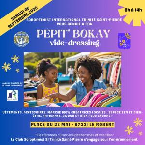 Le Club Soroptimist International Trinité Saint-Pierre avec le soutien de la Ville du Robert vous convie à son vide-dressing "PÉPIT' BOKAY" le Samedi 06 septembre 2025 de 8h à 14h à la Place du 22 mai du Robert.