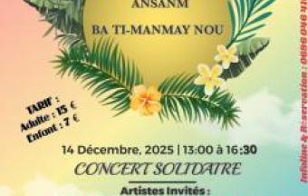 l'école élémentaire Occuline Amazan et l'association DLAprod vous invite à son concert solidaire "Ansanm Ansanm Ba ti-manmay nou" dimanche 14 décembre 2025 de 13h à 16h30 au Hall des sports de Mansarde.
