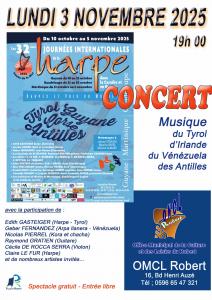 Dans le cadre de la 32ème journée internationale de la Harpe, l'association Glissando et l'Office Municipal de la Culture et des Loisirs du Robert vous invitent au concert de musique gratuit le lundi 3 Novembre à 19h sur le thème "Harpes et voix du monde".