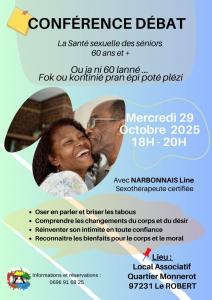 L'association Lanbeli vous propose une conférence-débat le mercredi 29 octobre 2025 de 18h à 20h au local associatif de Monnérot.sur le thème de la sexualité des seniors de 60 ans et plus