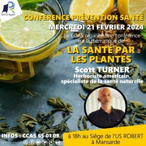 Le CCAS organise mercredi 21 février 2024 à 18h une conférence prévention santé sur la thématique de LA SANTE PAR LES PLANTES animée par Scott TURNER Herboriste américain, spécialiste de la santé naturelle au siège de l'US Robert à Mansarde.