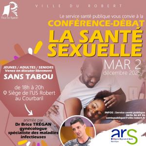 Le service santé publique de la ville du Robert vous convie à la conférence-débat "La santé sexuelle" animée par Dr Brice TRÉGAN (gynécologue spécialiste des maladies infectieuses) mardi 2 décembre 2025 de 18h à 20h au siège de l'US Robert au Courbaril.