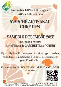 L'association ETINCELLES organise la 3ème édition de son marché artisanal chrétien le samedi 6 décembre 2025 de 8h à 16h sur le plateau de Gashette au Robert.