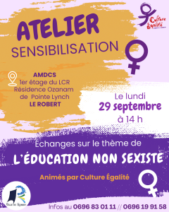 L'association "Culture-Égalité" vous convie à un atelier de sensibilisation sur le thème de l'éducation non sexiste le Lundi 29 septembre à 14h, à l'étage du LCR Résidence Ozanam de Pointe Lynch.