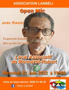 L'association Lanbéli vous invite à son "Open Mic" avec comme maitre de cérémonie Kwesi, mercredi 22 juin 2022 à 19h au local associatif de Monnerot.