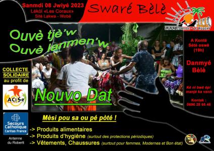 L'association ASCLR organise une "Swaré Bèlè" et une collecte solidaire au profit de l'ACISE et du Secours Catholique "Ouvè tjèw, Ouvè lanmenw" le samedi 8 juillet 2023 à partir de 19h à l'école "Les Coraux" de Cité La Croix au Robert.